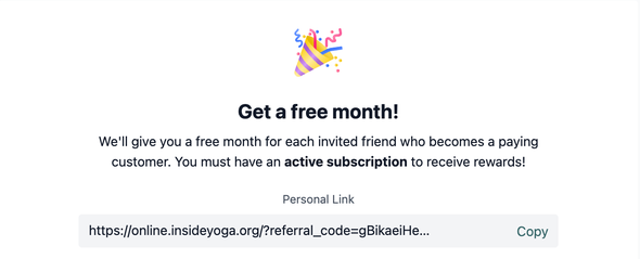 You love the Inside Online Home? By sharing it with your friends you gain not only a new yoga friend, but you can also earn 30 extra days that will be added to your membership.